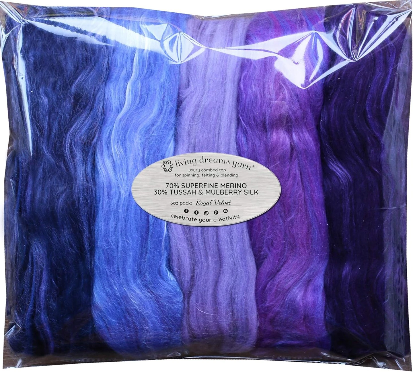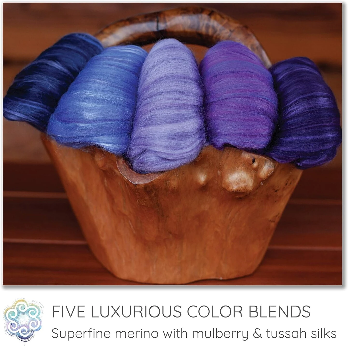 DETAILS: 5oz of Merino Silk Blend roving fiber – one oz of each color in the blend spectrum– 70% Superfine Merino 30% Mulberry & Tussah Silk Blend – 19 microns – Spinning, Wet Felting, Nuno Felting, Needle Felting, Blending and Paper Arts