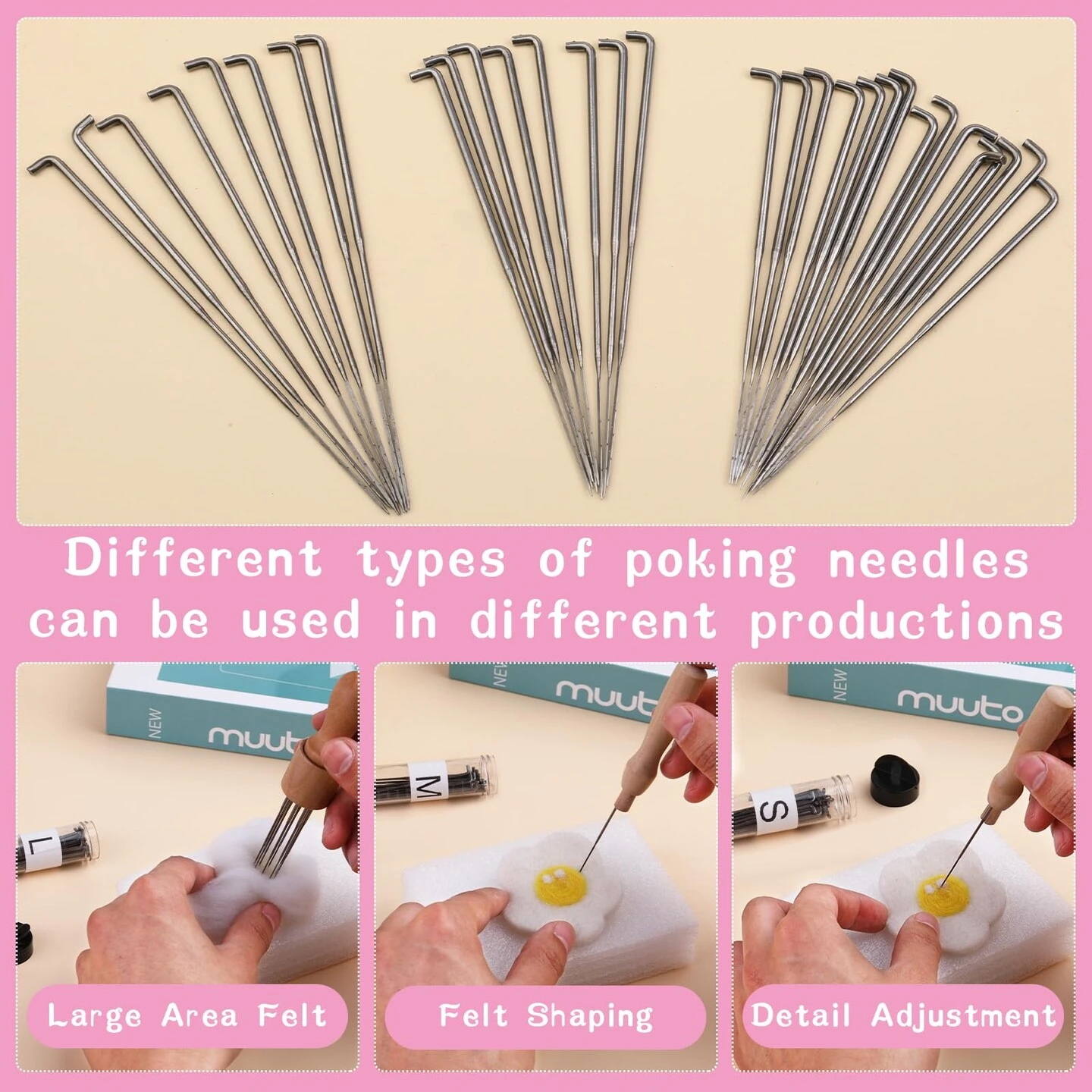 - Practical Needle Felting Kit: Including 30pcs 3.58 inch felting needles, 30pcs 3.39 inch felting needles, 30pcs 3.07 inch felting needles, 3pcs black clear bottles, 2 pcs wooden felting tool for meeting all of your needs for wool felting. Our felting needles and accessories are suitable for beginners and professionals, and three different models are suitable for different stages of making wool felt