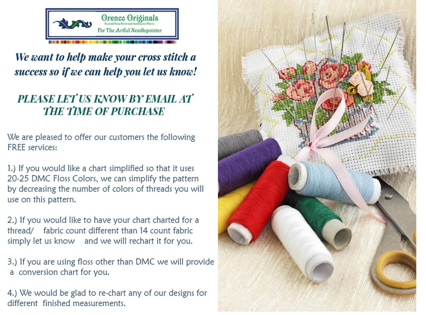 - Orenco Originals is happy to email you a supply list detailing the DMC Floss and number of skeins needed to complete the project so you can buy or organize floss to start stitching once your pattern arrives; email us after you order.