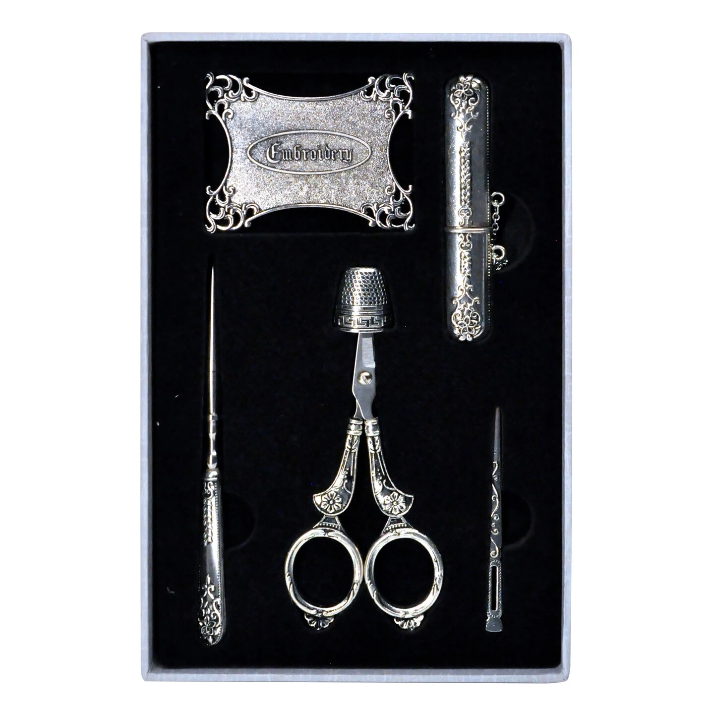 The Heirloom Embroidery Accessories display makes a great gift! This exquisite six-piece set is in a keepsake display. Beautiful and delicate engraving on high-quality silver accessories. It includes the tools most stitchers require! The accessories included are Embroidery Scissors, a Thimble, Bodkin, Needle Case, Awl, and Thread Winder. Combine this display with Sullivan’s threads to make the ultimate gift.