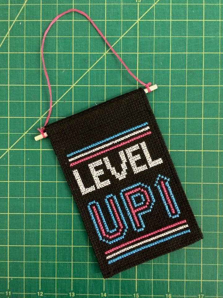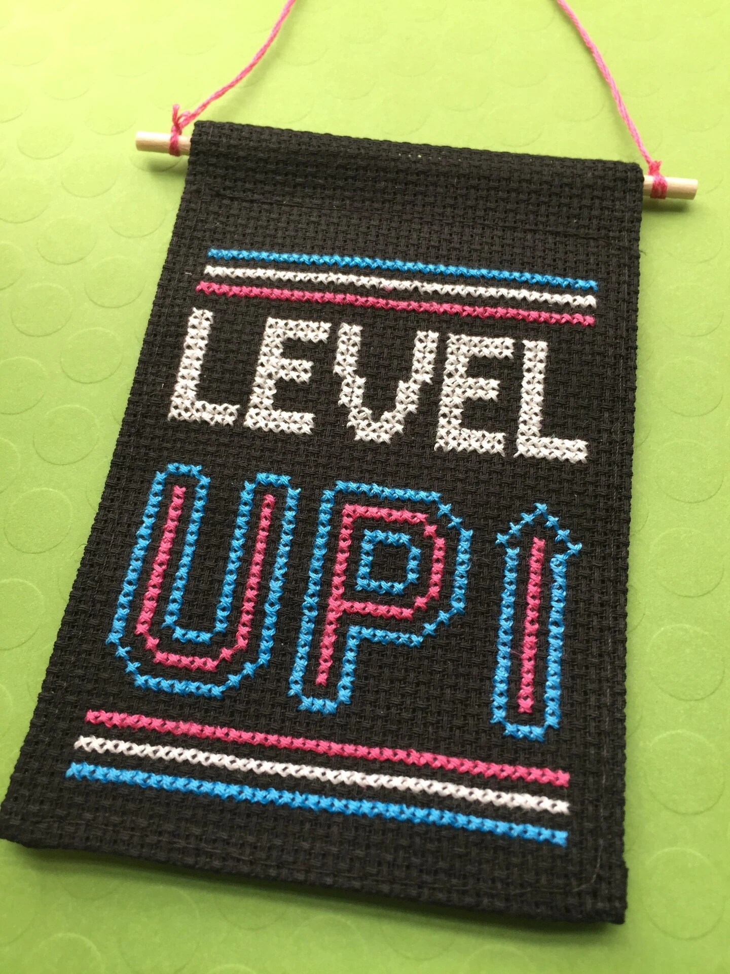This diy tiny banner kit features “Level Up” in neon thread on black aida cloth.