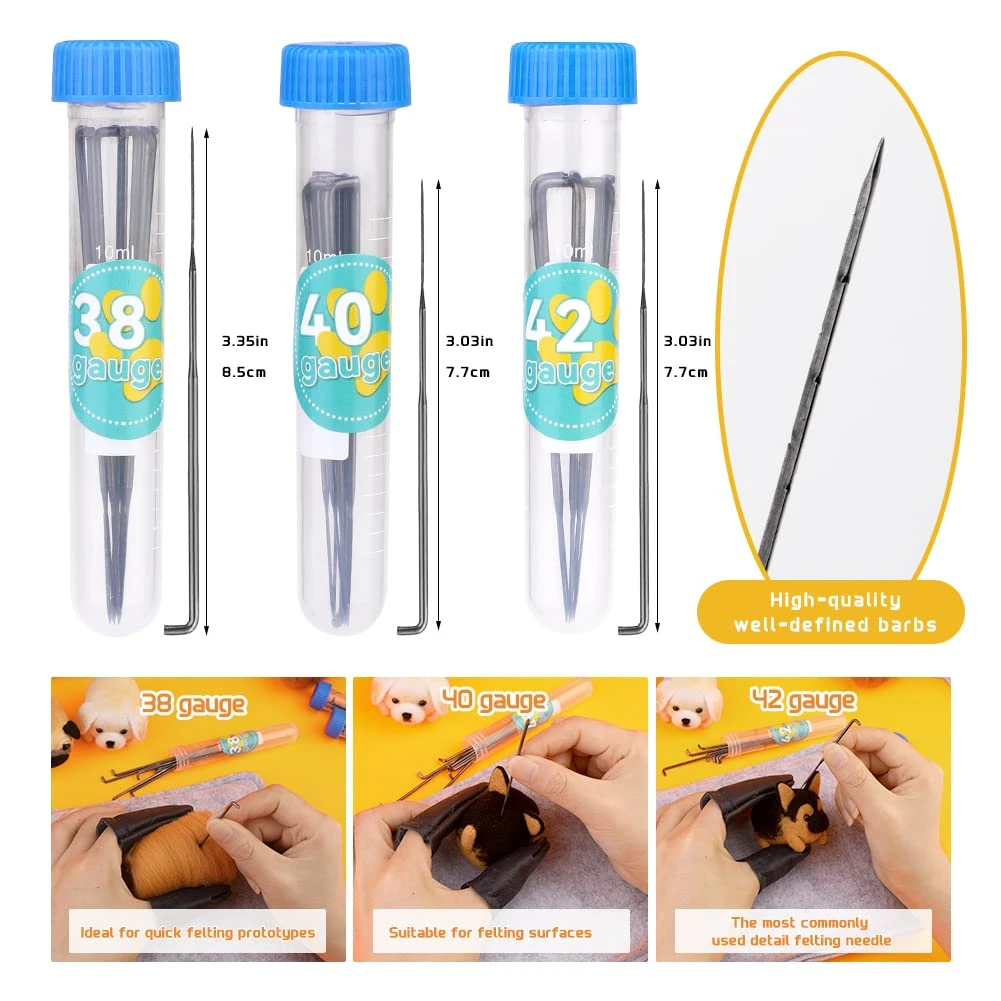 - 【24 Pieces of Felt Needles】Our needle felt kits provide 3 different sizes of felt needles. 38 gauge quickly bond wool together for early felting, 40 gauge for felting surface details, and 42 gauge for the finishing stage. The different felt needles are packaged in needle bottles with cute size labels for easy identification. Wipe the protective oil from the felting needles with a small rag before use.