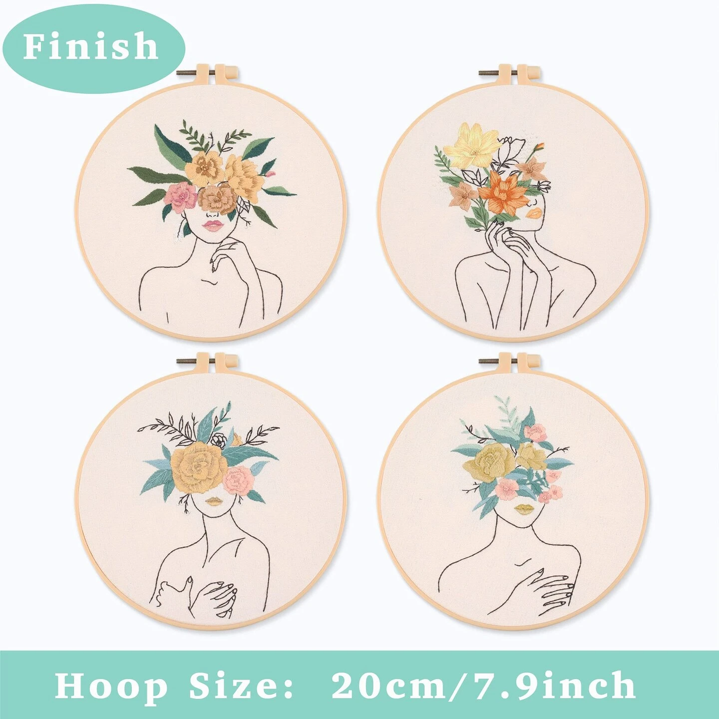 - [Beginner Kit] 4 pcs complete embroidery kits including: 4 pcs 11.8 inches x 11.8 inches (30 cm) cotton fabric with patterns, 2 pcs 7.8 inches (20 cm) embroidery rings, 1 scissors, 4 manual, 8 pins and enough colored thread.